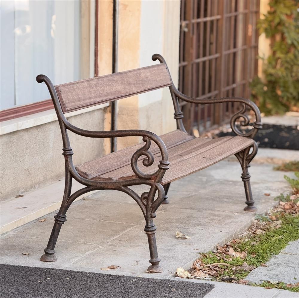 The cast-iron structure of the bench is completely original. The scrolling armrests, the ring-reinforced legs and the softly curved backrest reflect precisely those urban and garden productions typical of the late 19th to early 20th century. The metal has been left with its natural, time-worn patina, preserving the gentle oxidation that tells its story.