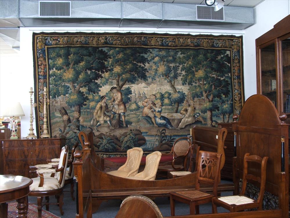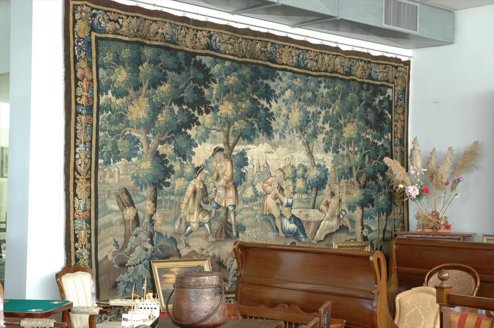 The composition is structured through successive tree screens, establishing depth and visual rhythm. Vegetation is handled as mass rather than ornament, evolving from traditional choux motifs into more articulated woodland forms. Figures are assured, neither rigid nor naïve, indicating a competent painterly source. Unlike more routine Aubusson production, this example retains a clear pictorial ambition.