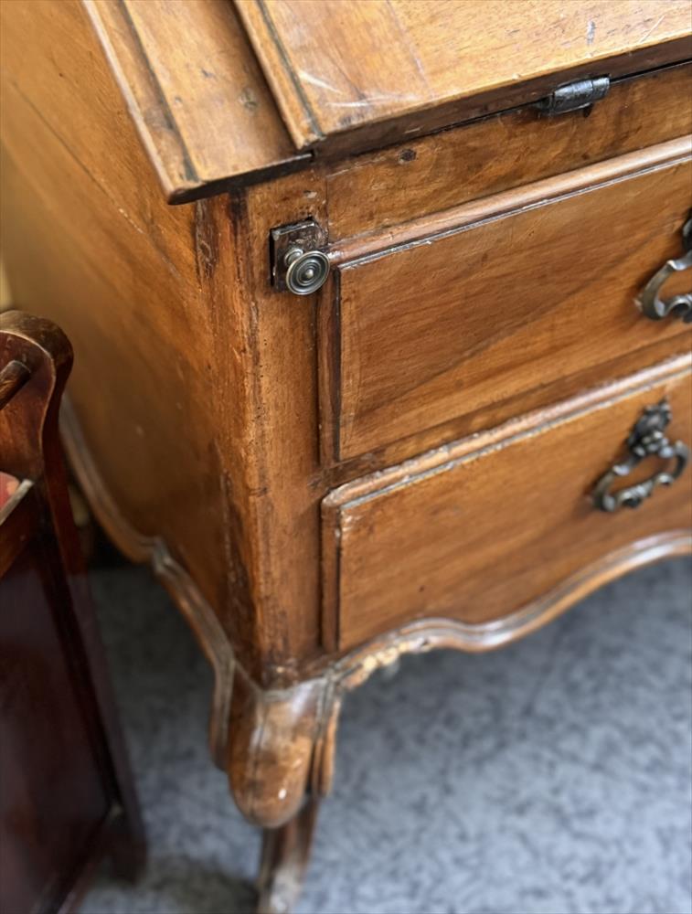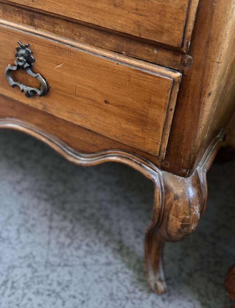 Il mobile, ben costruito, perfettamente autentico e ben conservato, è stato restaurato con interventi minimi: una leggera pulitura per preservarne la patina originale e un trattamento a base di cera calda per esaltare, senza alterazioni, i colori e le sfumature naturali del legno. Interni puliti, serrature funzionanti, maniglie originali in bronzo.