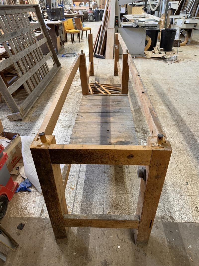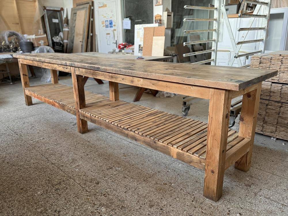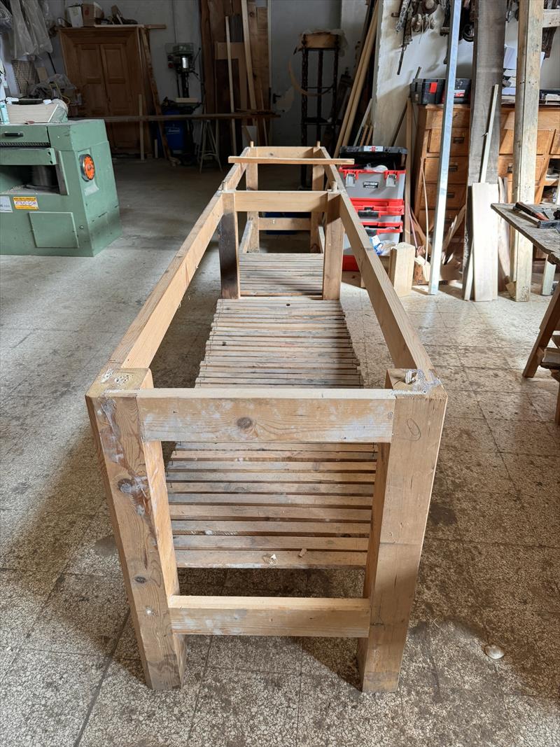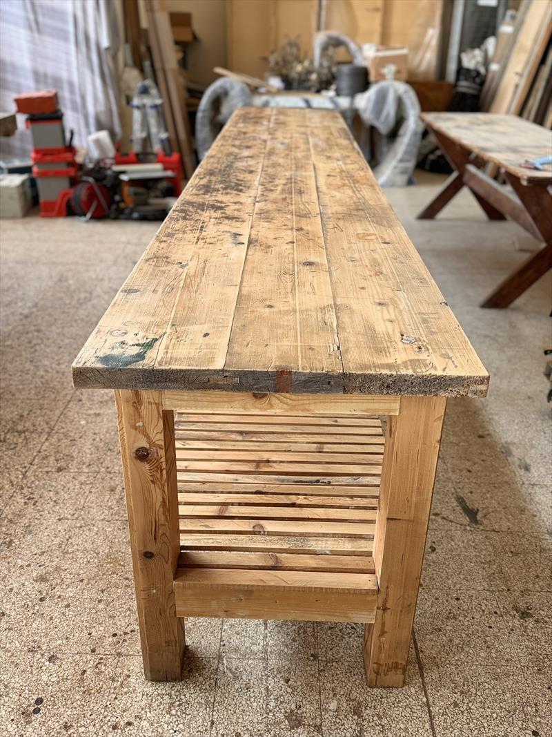 Un lungo tavolo da lavoro, nato nei primi decenni del Novecento, costruito in legno di abete. Non un mobile nobile, ma un compagno silenzioso di bottega o di mesticheria, forse anche di un annesso agricolo: robusto, pratico, pensato per resistere a peso, urti e macchie.