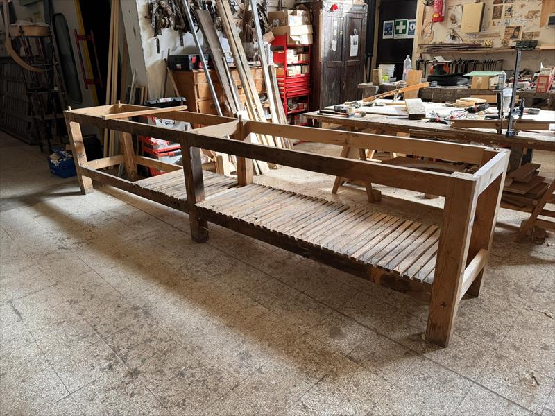 Il piano porta ancora i segni di una vita operosa: graffi, bruniture, residui di mestieri che si sono succeduti negli anni. Tracce che non sono state cancellate, ma consolidate e pulite con rispetto, per restituirgli stabilità senza tradirne l’anima autentica. La lunga mensola inferiore a listelli completa la struttura, offrendo spazio funzionale e un ritmo visivo semplice, essenziale.