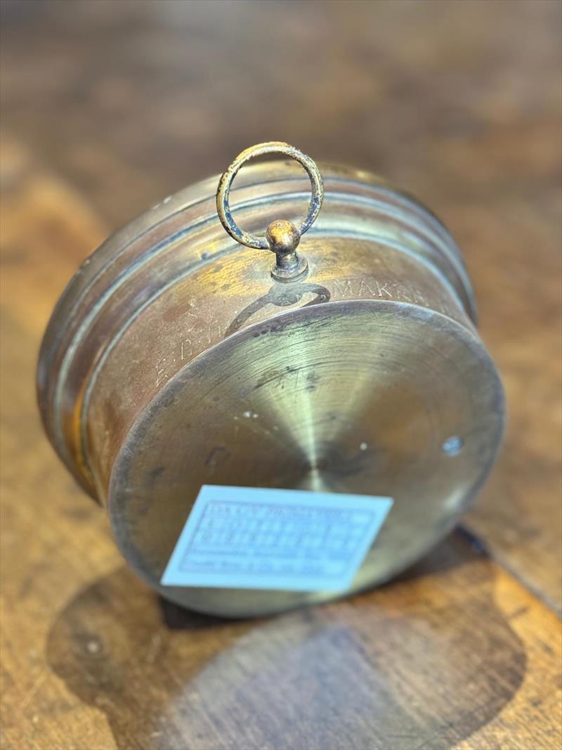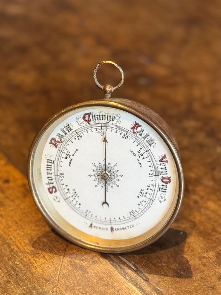 Piccolo barometro aneroide da viaggio, realizzato in Inghilterra tra la fine dell’Ottocento e i primi anni del Novecento. La cassa in ottone pieno, consumata dal tempo e dalle mani, conserva una patina autentica, scura e irregolare: quella che nasce solo quando un oggetto è stato davvero usato, non semplicemente custodito.