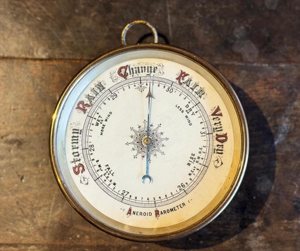 Il quadrante in carta calibrata, con grafica vittoriana “Stormy / Rain / Change / Fair / Very Dry”, racconta un’epoca in cui non esisteva ancora il meteo moderno. Nessuna previsione, nessun bollettino: l’unica bussola per capire il cielo era l’osservazione diretta. Per questo strumenti come questo erano compagni indispensabili — per i capitani di mare che leggevano il vento prima di una traversata, per i geografi che studiavano i climi, per chi viveva di agricoltura e sapeva che una variazione di pressione poteva decidere il raccolto.