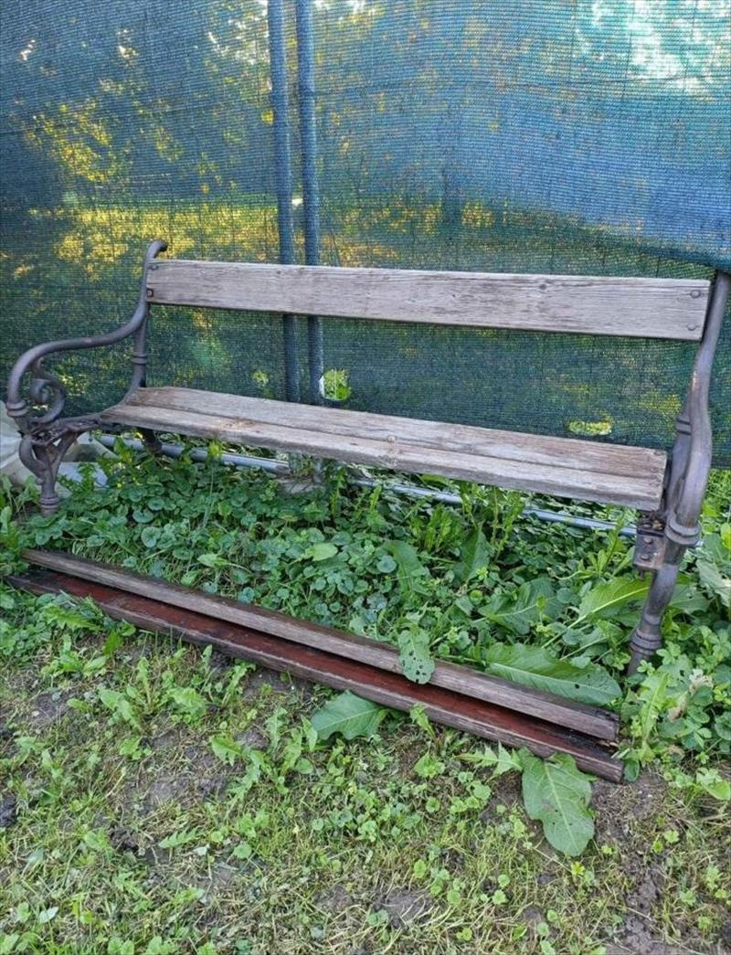La struttura della panchina, in fusione di ghisa, è completamente originale. Le volute dei braccioli, le gambe rinforzate ad anello e la curva leggera della spalliera rimandano proprio a quelle produzioni urbane e di giardino diffuse tra fine Ottocento e primissimo Novecento. È stata conservata così com’è, con la patina brunita e le piccole ossidazioni che testimoniano il tempo.