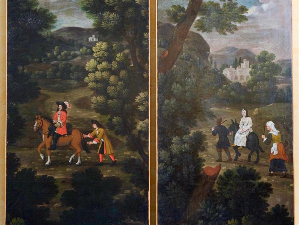 La seconda scena, con la figura femminile sull’asino accompagnata lungo il percorso, richiama modelli iconografici diffusi anche in ambito religioso, dove questo schema veniva utilizzato per rappresentare episodi di viaggio. Qui la lettura resta aperta, ma contribuisce a definire il carattere della composizione.
