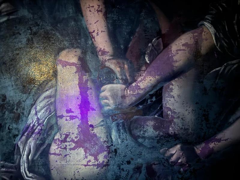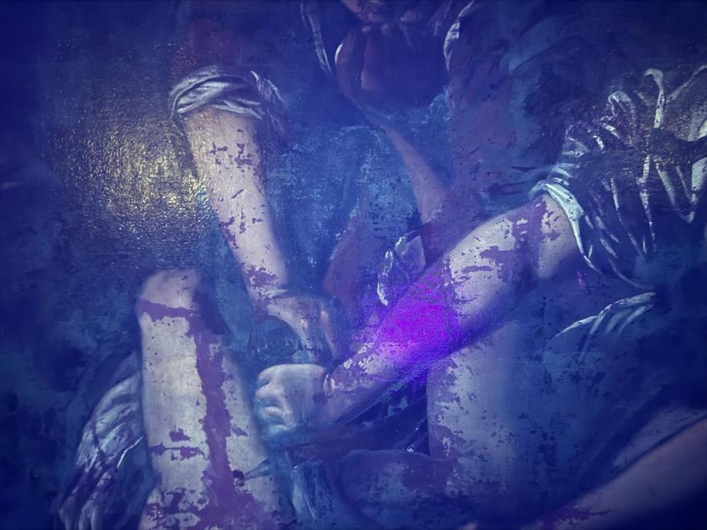La superficie pittorica presenta interventi di restauro e ridipinture diffusi, evidenti anche in luce di Wood, con perdite di materia e integrazioni legate a una conservazione non lineare.