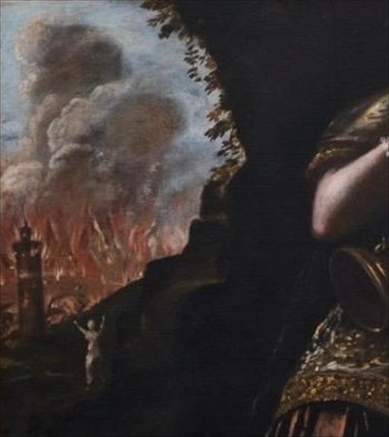 Sul fondo, a sinistra, la città brucia ancora. Le fiamme salgono compatte, il fumo chiude lo spazio e tra le rovine emerge una figura chiara, isolata: è la moglie di Lot, già trasformata in statua di sale. Un dettaglio piccolo ma decisivo, che segna con precisione ciò che è stato perduto.