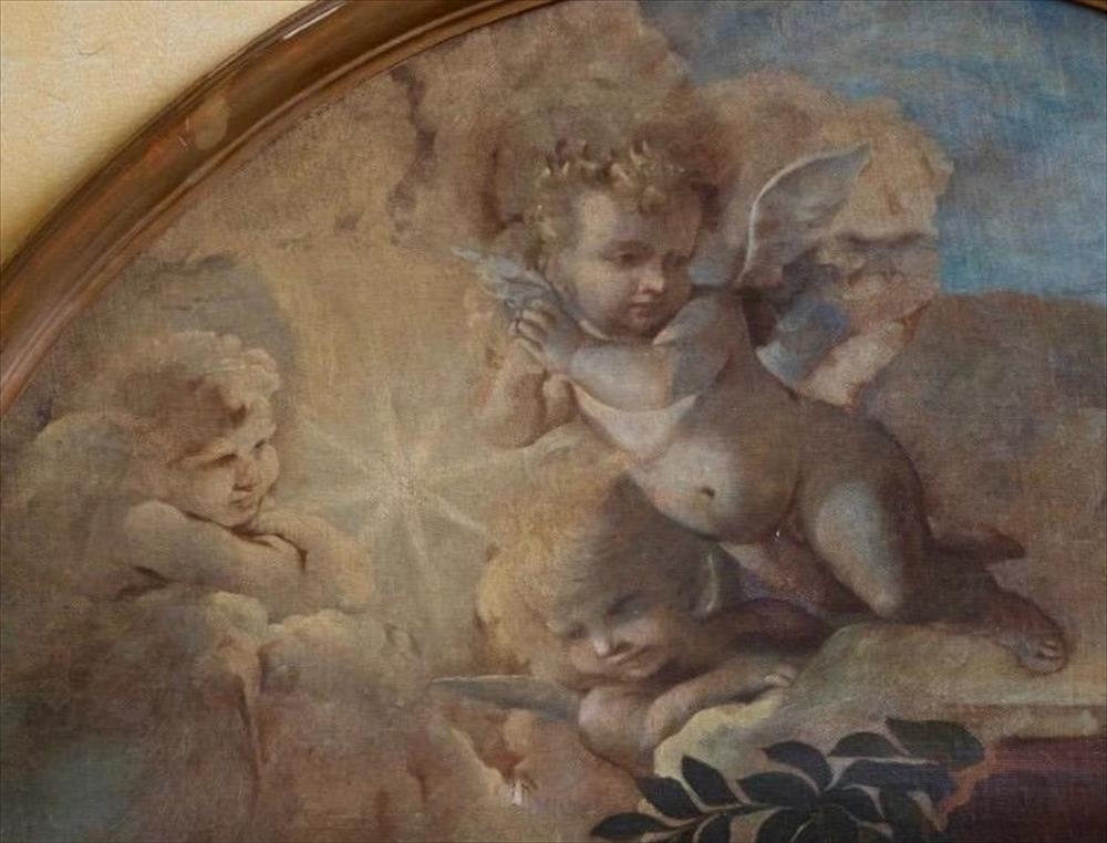Questa tela è la parte superiore di una pala d’altare: una lunetta pensata per chiudere la composizione sopra la scena principale e accompagnare lo sguardo verso l’alto. Non è un’immagine autonoma, ma un elemento pensato per integrarsi con l’architettura sacra.