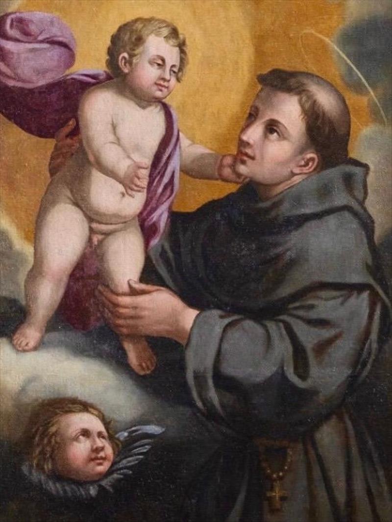 Il Bambino non si limita a comparire, ma entra nello spazio del santo e lo coinvolge. Il gesto è semplice, ma sufficiente a spostare la scena da un episodio miracoloso a una relazione concreta.