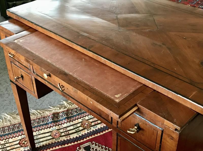 Tapered legs, five drawers, a pull-out shelf covered in leather, and a sliding top—an ingenious feature designed to expand the work surface or allow two people to write facing each other.