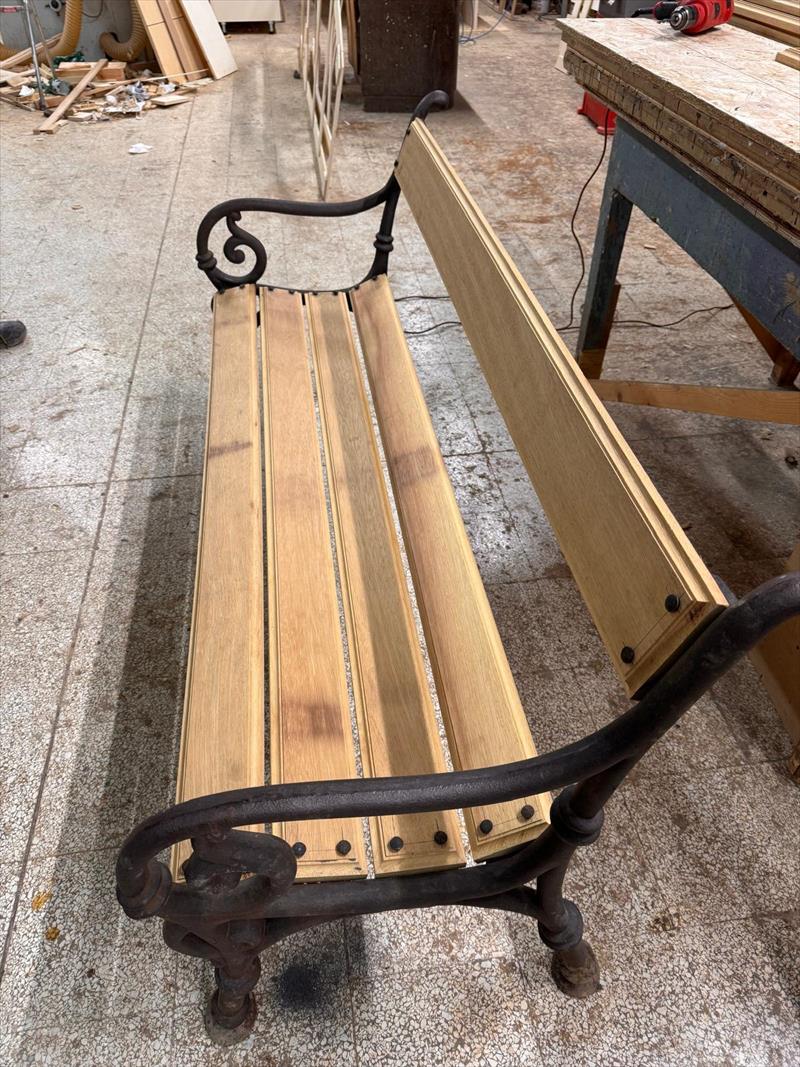 The wooden boards of the seat and backrest, on the other hand, were beyond saving—as seen in the initial photos: decayed, warped, and compromised by humidity. They have been rebuilt following the original spacing and profiles, but in solid teak, chosen for its natural stability and its ability to withstand outdoor exposure without heavy treatments.