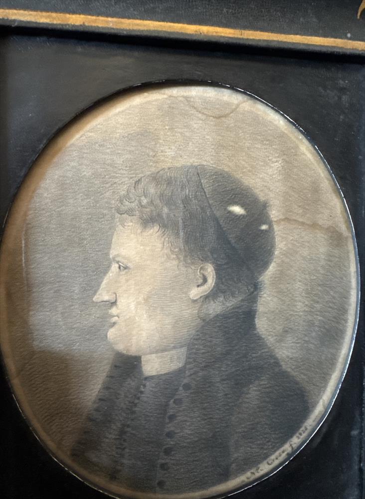 The dark garment, buttoned up to the neck, and the close-fitting cap point to a regular ecclesiastical context, likely connected to a chapter or seminary environment.