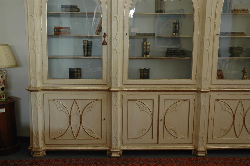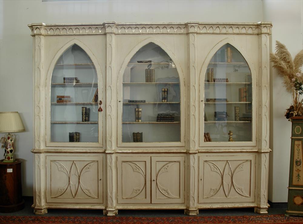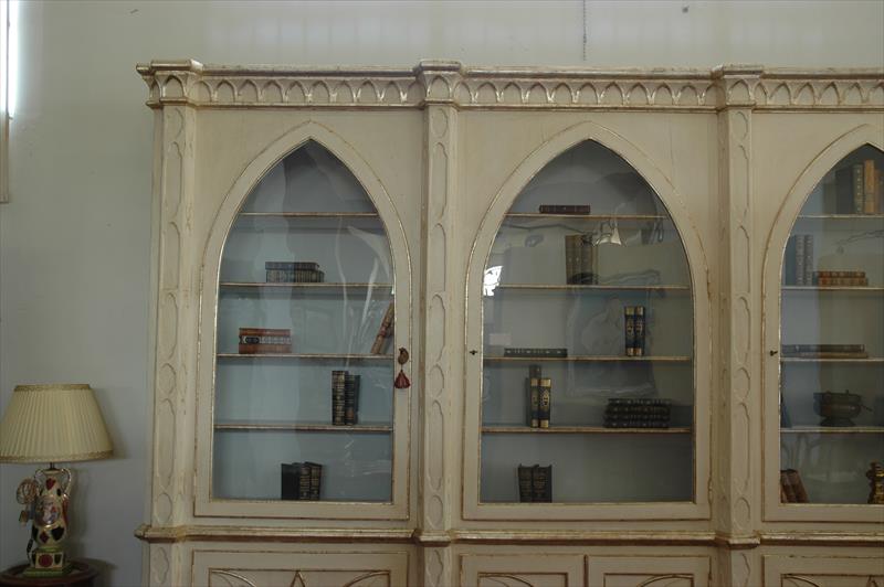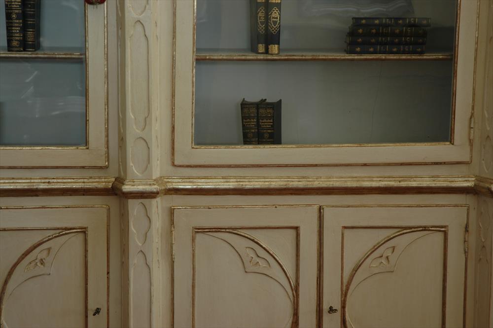 Le tre alte vetrine con archi acuti, che racchiudono ripiani sottili e regolari, insieme al fregio superiore scandito da piccole arcature, interpretano con equilibrio e luminosità il linguaggio decorativo dell’epoca.