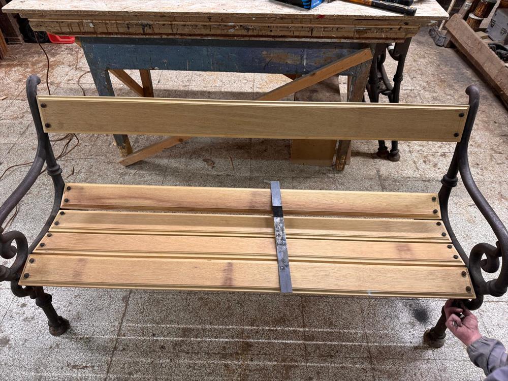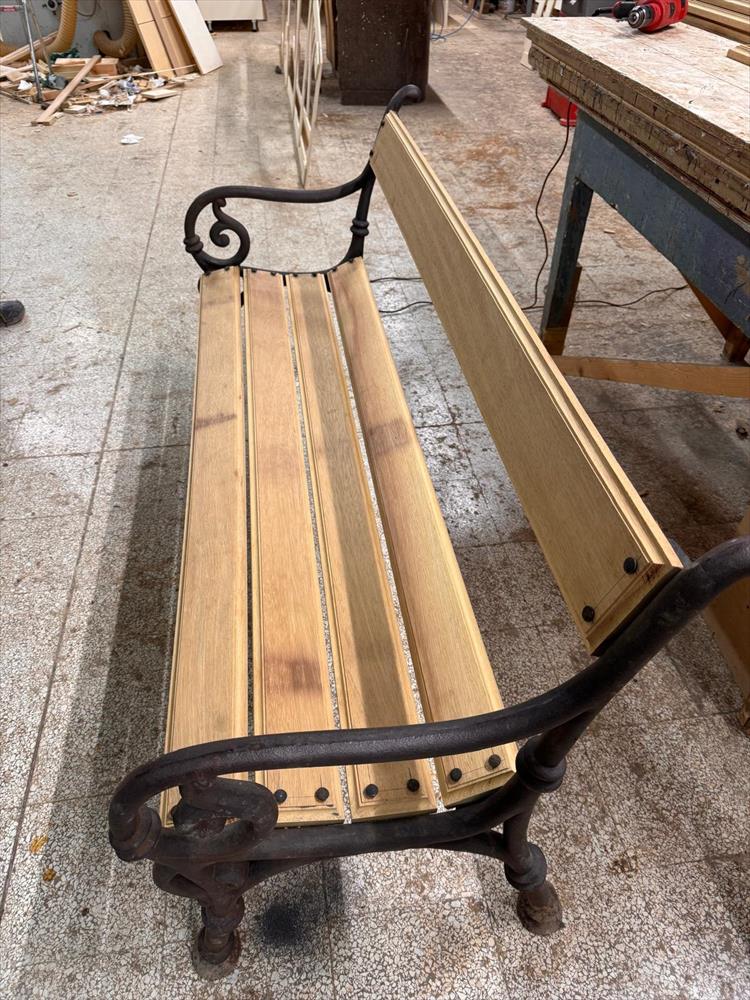 La struttura della panchina, in fusione di ghisa, è completamente originale. Le volute dei braccioli, le gambe rinforzate ad anello e la curva leggera della spalliera rimandano proprio a quelle produzioni urbane e di giardino diffuse tra fine Ottocento e primissimo Novecento. È stata conservata così com’è, con la patina brunita e le piccole ossidazioni che testimoniano il tempo.