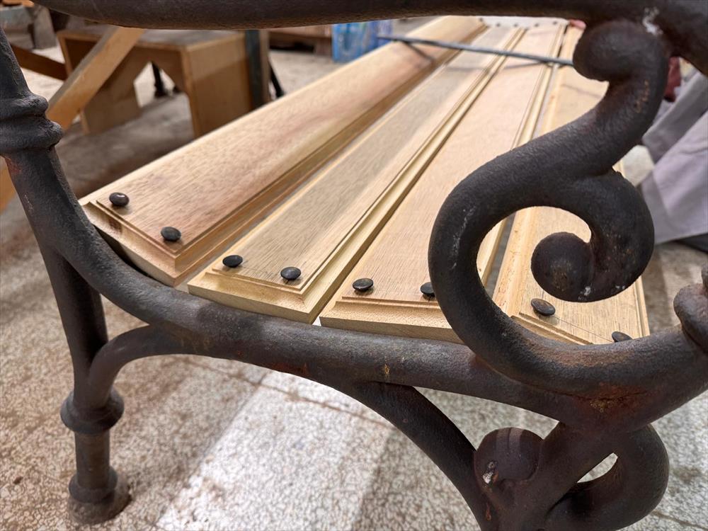 Le tavole della seduta e dello schienale invece non erano recuperabili, come si vede dalle foto iniziali: marcite, deformate, consumate dall’umidità. Sono state rifatte rispettando passo e profili originali, ma in legno di teak, scelto per la sua stabilità e per la capacità di resistere agli agenti esterni senza trattamenti invasivi.