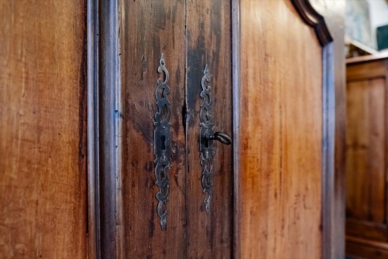 costruita in legno massello di gattice dalla splendida patina bicolore, con due porte con insolita incernieratura laterale, cornice superiore delle ante a sagoma ricurva e piedi a cartella.