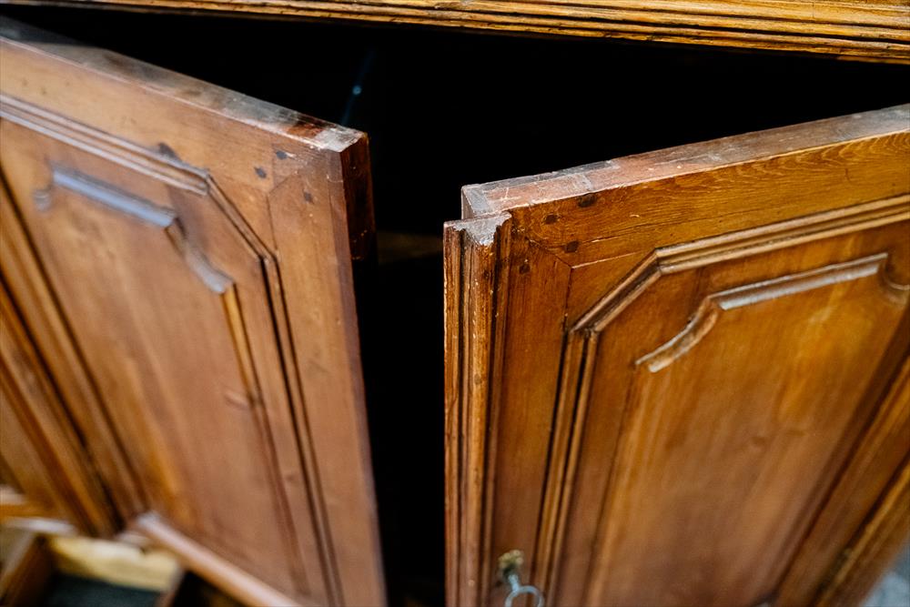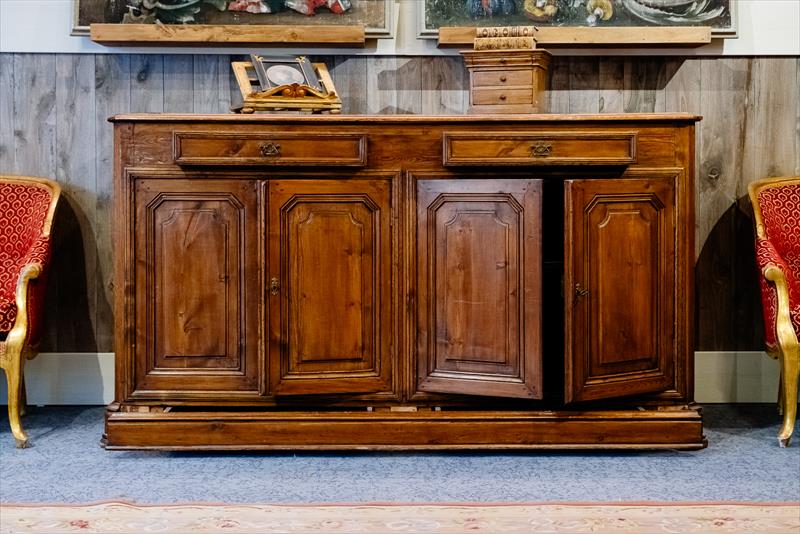 Credenza umbra di metà Ottocento con quattro porte, due cassetti e un cassetto a scomparsa abilmente integrato nella balza dello zoccolo